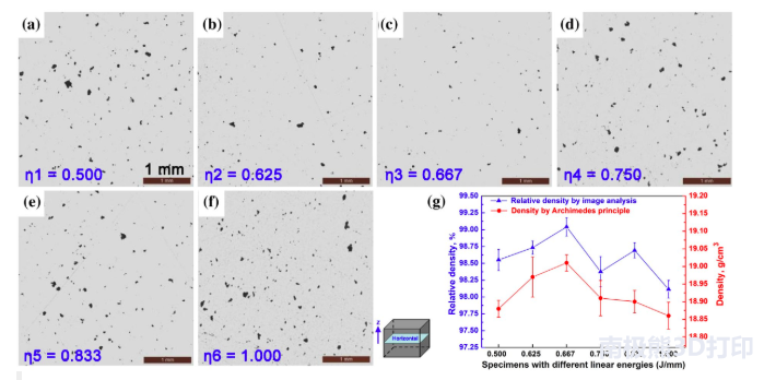 图1显示由不同线性能量(J / mm)SlM生产的纯钨的水平横截面中孔隙的光学显微照片:( a)η1= 0.500,(b)η2= 0.625,(c)η3= 0.667,(d)η4= 0.750,(e)η5= 0.833,(f)η6= 1.000; (g)阿基米德密度和实际密度