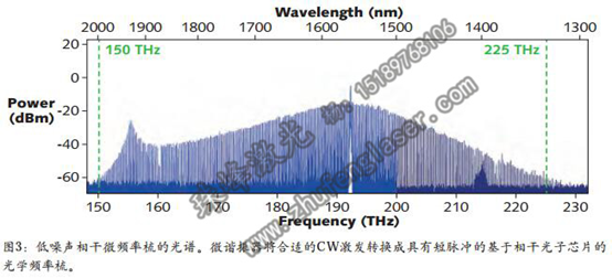 所得到的频率梳的性质,在很大程度上取决于泵浦激光波长,因为CW 激光器可以激发非相干高噪声状态以及孤子态。孤子态是有利的,因为所得到的频率梳是相干的并且具有极低噪声、窄线宽和短脉冲。如果从较高频率到较低频率扫描泵浦激光器,将发生不同孤子态间的急变阶段。每个阶段对应于在微谐振器中循环的孤子数量的连续减少。通过反馈至激光器,可以在其中一个阶段稳定微型梳,从而允许稳定的孤子操作。图 3所示为由可调谐二极管激光器泵浦氮化硅(SiN ;见图 4)制成的这种微腔的光学单孤子光谱。