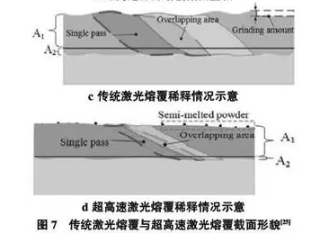 传统激光熔覆与超高速激光熔覆的典型截面金相分别如图7所示。