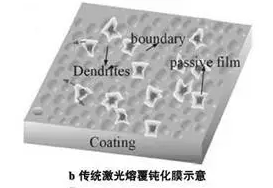 超高速激光熔覆技术作为硬铬电镀的替代技术,涂层的抗腐蚀性能是其主要考核指标之一。Li Liqun[25]和Shen Bowen等[20]测试了AISI 431涂层的电化学性能,阳极极化曲线(见图9a)计算可得超高速激光熔覆涂层的腐蚀电流约为0.3236μA,低于传统激光熔覆涂层的0.4322μA,因此超高速激光熔覆涂层具有更优的抗腐蚀能力。Li Liqun[[25]指出超高速激光熔覆涂层较传统激光熔覆涂层组织更为均匀细密,涂层中Cr元素分布均匀,这有利于富Cr钝化膜的形成,从而提升涂层材料的抗蚀能力。传统激光熔覆与超高速激光熔覆AISI 431涂层的钝化膜生长机理分别如图9b、图9c所示。